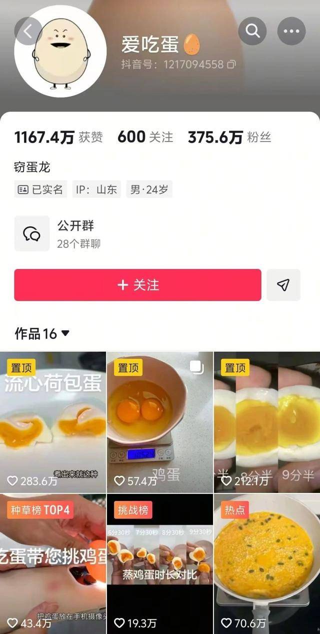 “爱吃蛋”的出圈始于一次精准的评论。笔者梳理发现,这位网友名叫“爱吃蛋”,截至12月12日中午,在某社交平台的粉丝数位375.6万,视频作品共16个,全是关于鸡蛋的做法。其中点赞最高的一条是近日他分享的一枚拥有“小行星”一般纹路的完美水煮蛋。