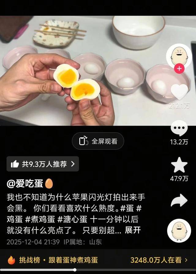 这哪里仅是煮蛋?分明是水滴石穿的功夫,是《庄子》笔下“用志不分,乃凝于神”的当代写照。当不少美食博主忙于花样翻新、追逐热点时,他将全部心神倾注于一枚鸡蛋从生到熟的全然了悟之中。这种极致的专注,说匠心有点夸张,但细心细致是有的。