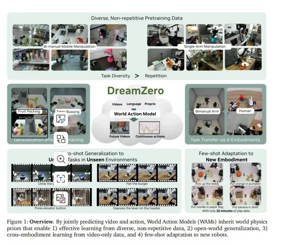 近期斯坦福、英伟达发布的Cosmos Policy等研究给出了Zero-shot(零样本)就能泛化执行不同工作的具身模型的可能,即通过视频生成模型训练机器人的“物理直觉”:先学会“如果发生某种情况,世界会怎样演变”,再以此为基础规划“我该如何行动”。